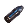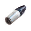 5 pole male cable connector with black metal housing and gold contacts.