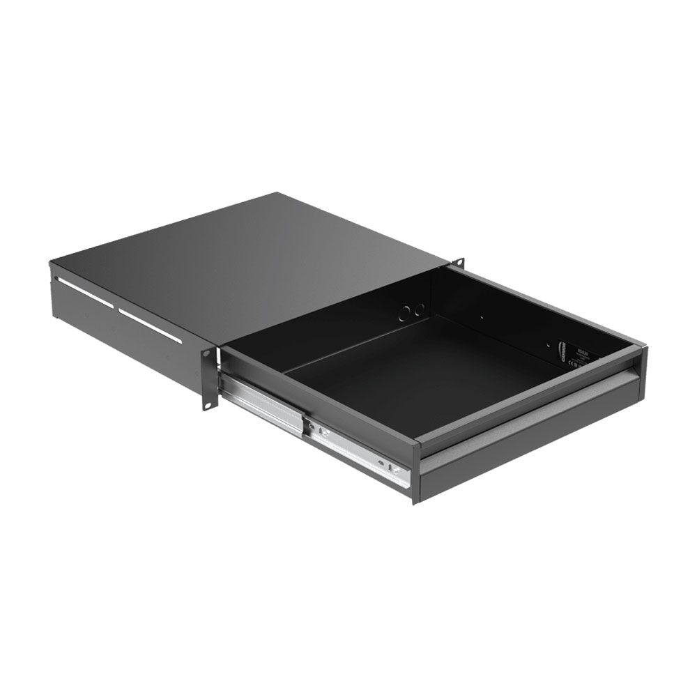 The RDx20x series of 19” rack drawers comes available in 1U, 2U and 3U unit heights with and without lock. The chassis is constructed of 1,5 mm thick cold rolled steel, while the tray is finished in 1,2 mm thick cold rolled steel. They feature full extension 3 section drawer rails, pushout holes on the back of the tray for cable insertion, a rubber anti slip liner, a full-width handle and optional back supports (RD2S) for increased load capacity (only 2U and 3U).