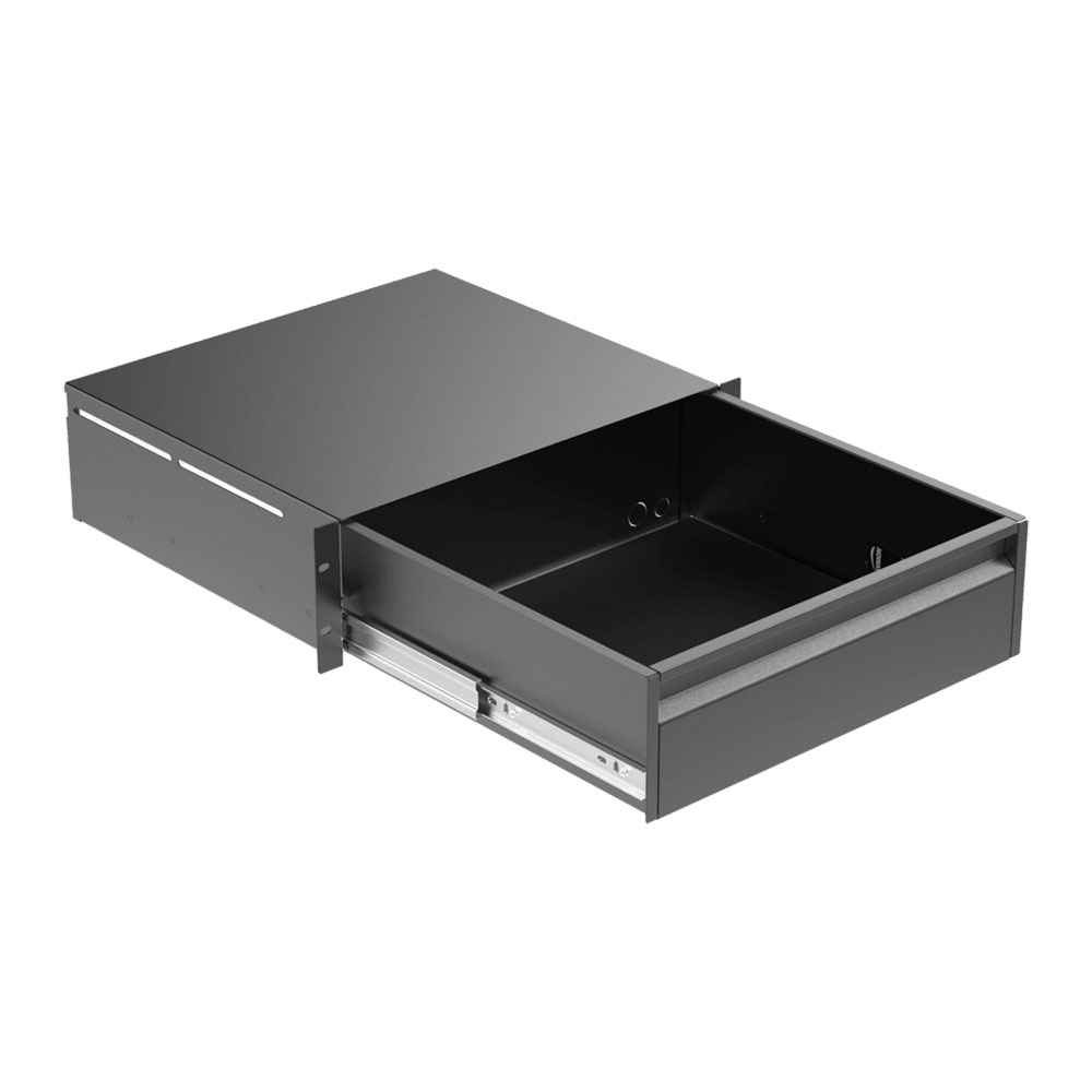 The RDx20x series of 19” rack drawers comes available in 1U, 2U and 3U unit heights with and without lock. The chassis is constructed of 1,5 mm thick cold rolled steel, while the tray is finished in 1,2 mm thick cold rolled steel. They feature full extension 3 section drawer rails, pushout holes on the back of the tray for cable insertion, a rubber anti slip liner, a full-width handle and optional back supports (RD2S) for increased load capacity (only 2U and 3U).