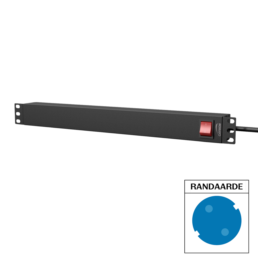 The total height covers a single 19” rackspace, allowing it to be installed in any 19” housing or equipment rack. Using the rotatable side ears, wall mounting is also made possible. Input connections are made using a fixed 2.5 meter connection cable fitted with a male schuko (CEE 7/7) plug, while German (Type F – CEE 7/4) output sockets allow power distribution to nine devices. A chassis earth connection point is provided for easily connecting your rack/enclosure to mains earth, as required by safety regulations.