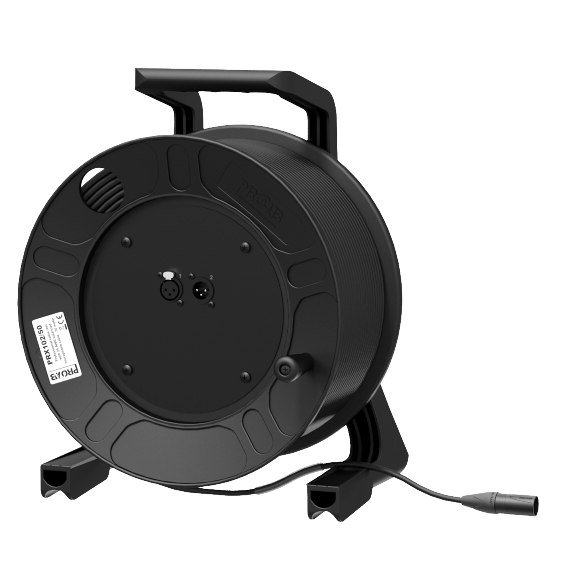 The PRX102 is a HighFlex balanced microphone cable (RMC306) assembled on a lightweight, extremely strong and impact resistant plastic reel (CDM310). The conductor section is constructed using two 24 AWG stranded conductors which are surrounded by a braided shielding, offering a high immunity against noise and interference caused by external devices. The cable is jacketed using highly flexible and durable PVC materials, which guarantee a high flexibility and reliability for mobile applications. The cable end is terminated using a male Neutrik XLR connector (Silver contacts, black metal XLR housing) while the chassis side is fitted with both a male and femaleNeutrikXLR connector allowing linkthrough.